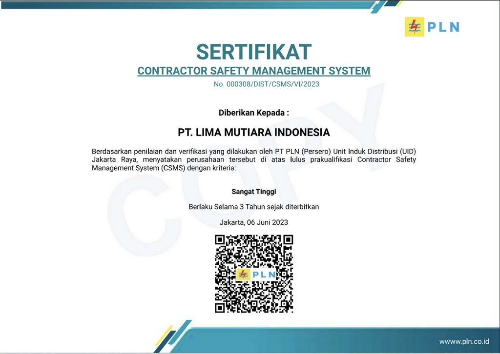 PT. LIMA MUTIARA INDONESIA berkomitmen menjadi perusahaan kontraktor swasta nasional terdepan dibidang perdagangan dan jasa konstruksi berdasarkan prinsip “Total Quality Management (TQM)” dan “Total Improvement Management (TIM)” sehingga dapat memberikan Total Quality Service bagi para pengguna Jasa di seluruh Perusahaan dengan mengutamakan mutu pelayanan serta aspek kesehatan dan keselamatan kerja dalam pelaksanaan segala aktifitas perusahaan. Bagi kami, perencanaan solusi konstruksi yang tepat, berkualitas dan terjangkau adalah suatu dedikasi tersendiri yang dapat kami banggakan.
