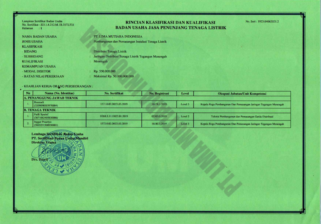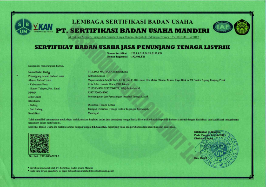 PT Lima Mutiara Indonesia adalah perusahaan yang bergerak di bidang konstruksi elektrikal dan general elektrikal supplier yang berdiri dan mulai hadir melayani pada tahun 2020. Perusahaan ini didirikan dengan tujuan untuk menyediakan solusi konstruksi dalam industri kelistrikan sekaligus pasokan berkualitas dalam menunjang hal tersebut. Cangkupan operasional PT Lima Mutiara Indonesia saat ini meliputi wilayah DKI Jakarta, Jawa Barat dan Banten.