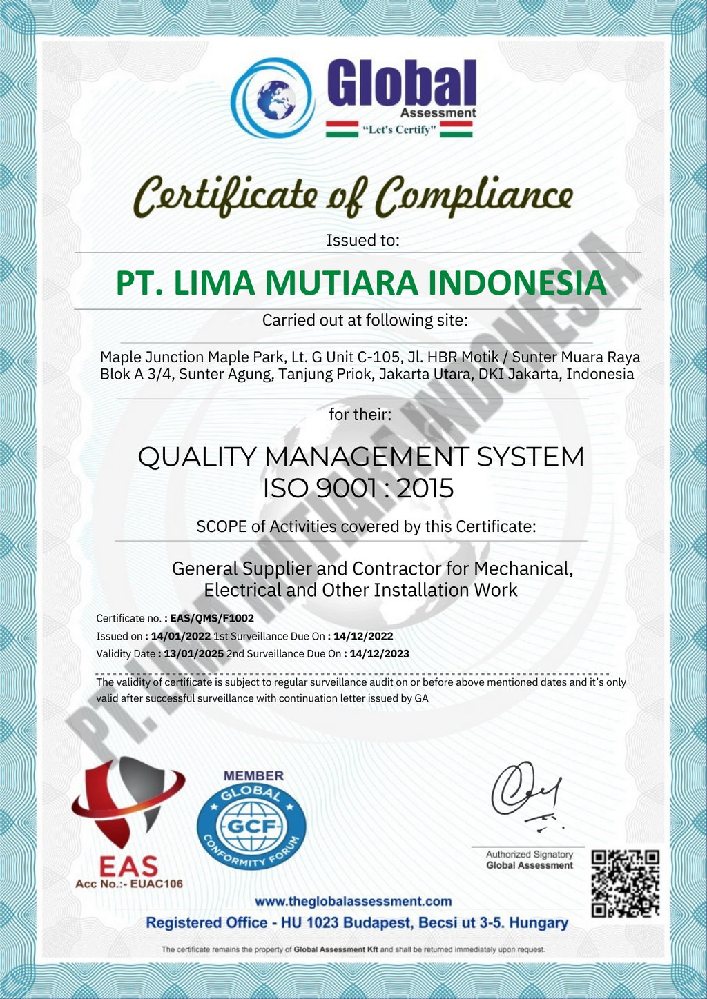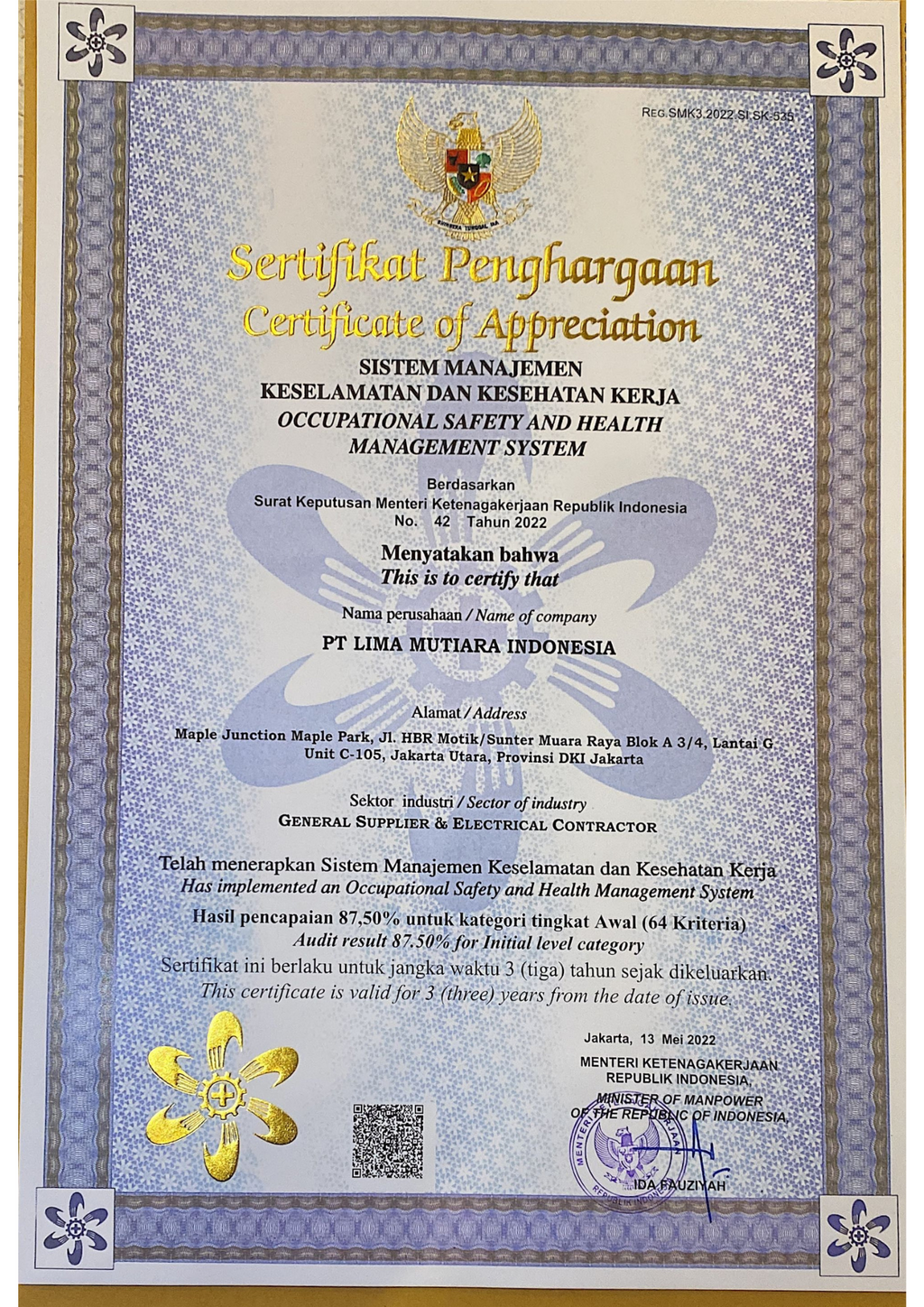PT Lima Mutiara Indonesia berkomitmen untuk memberikan solusi konstruksi yang tepat, berkualitas dan terjangkau sehingga mampu memberikan kepuasan maksimal bagi para pelanggan dan membangun kepercayaan pelanggan terhadap perusahaan kami. Selain mengutamakan mutu pelayanan, kami juga sangat memperhatikan aspek kesehatan dan keselamatan kerja melalui penerapan sistem manajemen K3 dalam setiap pekerjaan yang kami lakukan sebagai upaya menjaga kenyamanan dan keamanan berbagai pihak.