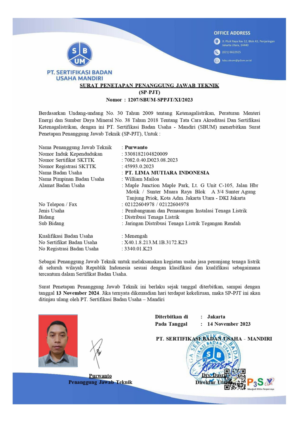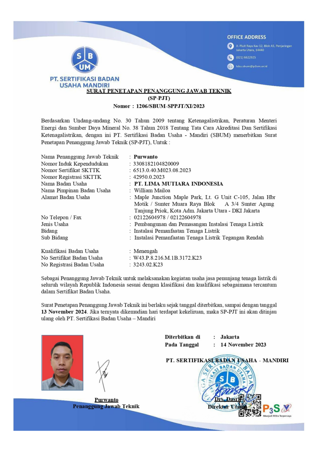 Memberikan pelayanan, mutu, dan kepuasaan terbaik kepada pelanggan dan stake holder dengan tata kelola perusahaan yang baik (Good Corporate Governance) serta turut berpartisipasi dalam pengembangan negara republik indonesia melalui program energi baru terbarukan dan konservasi energi (EBTKE). Melaksanakan pengusahaan sektor konstruksi dengan berkomitmen berwawasan mutu dan mengutamakan kesehatan dan keselamatan kerja, serta keunggulan yang memberikan nilai tambah bagi stakeholder.